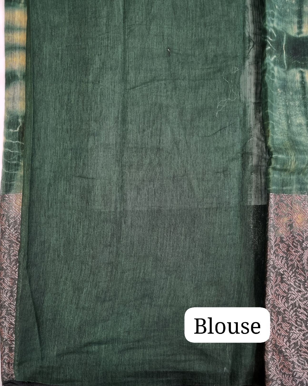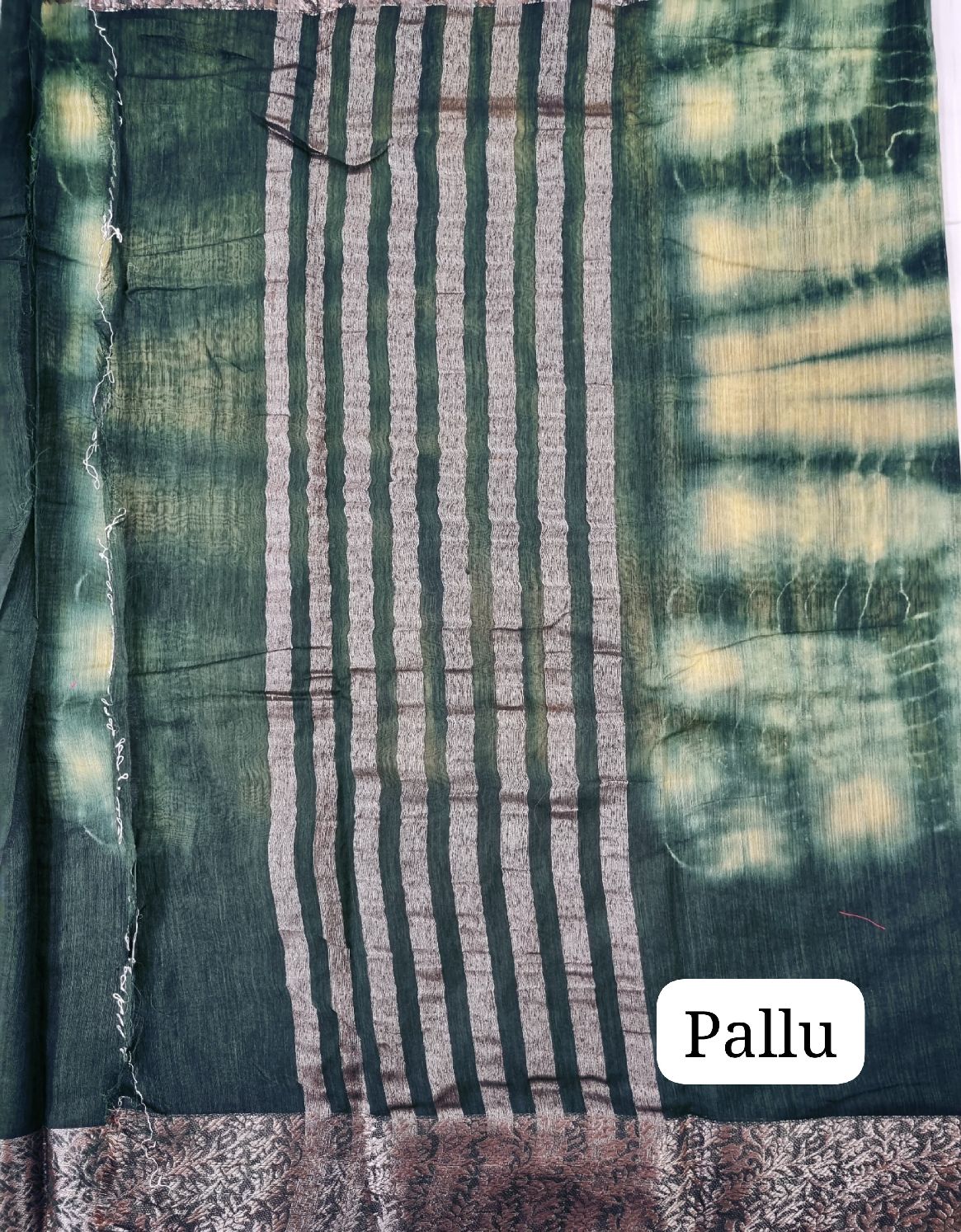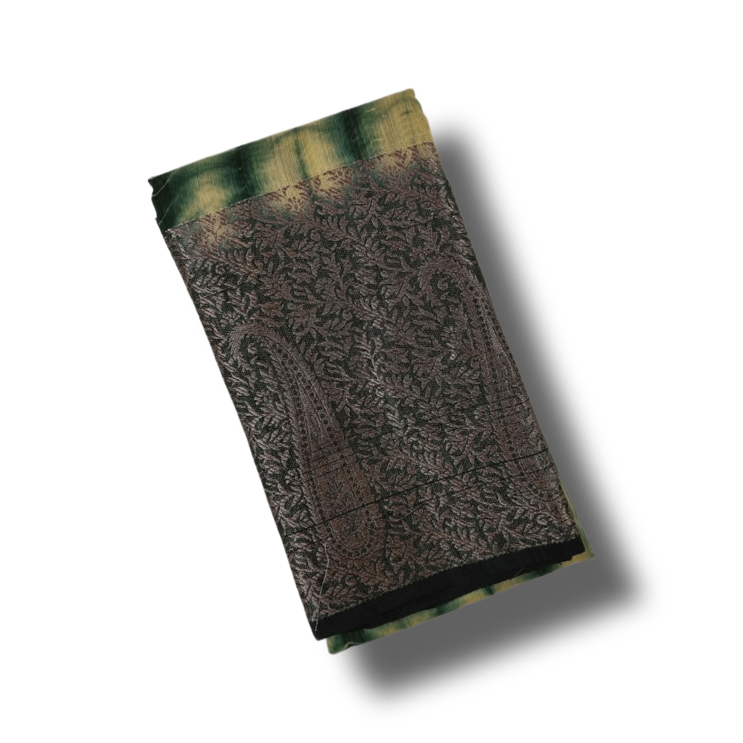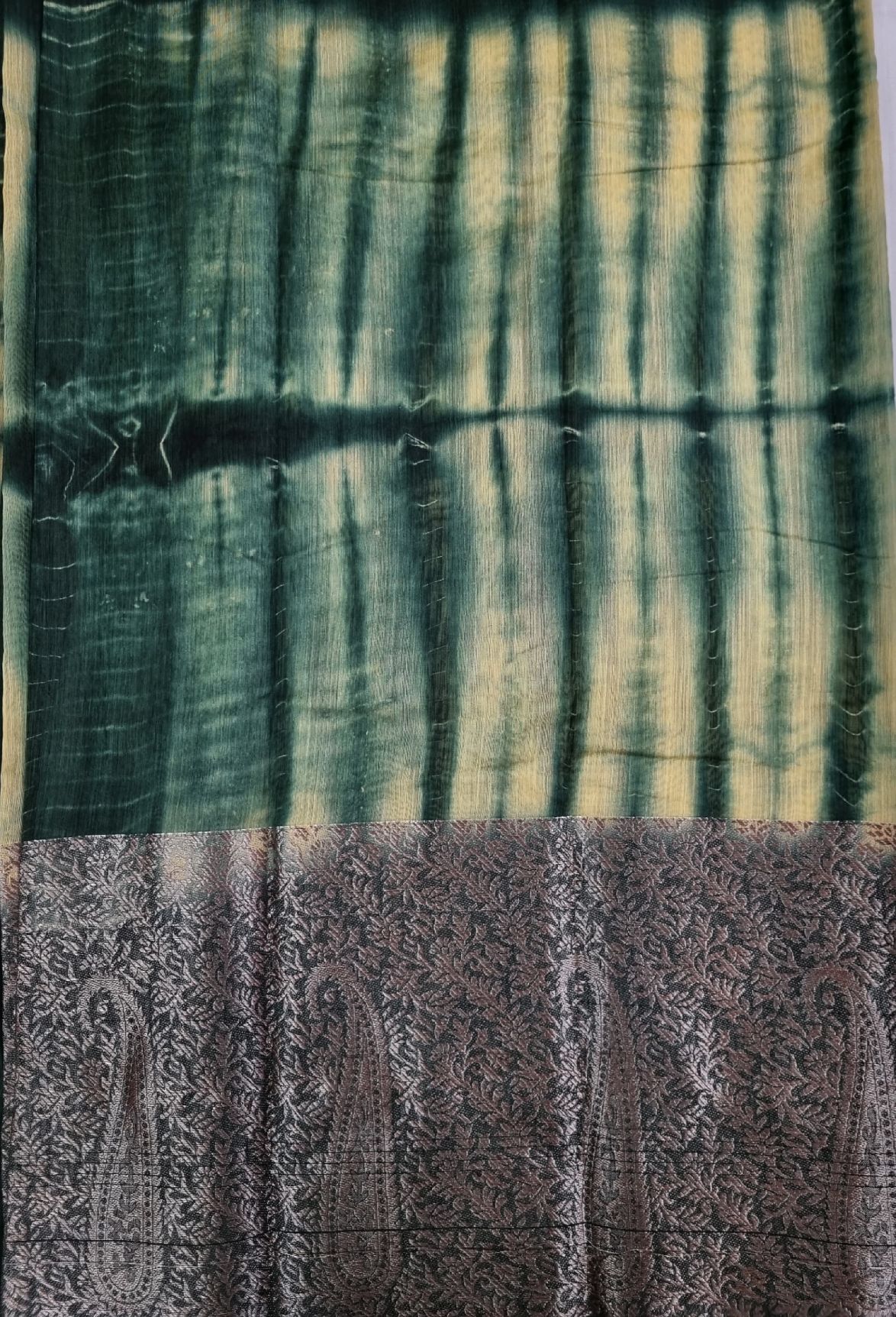 Mesmerizing shibori tie-dye effect in deep green tones, beautifully paired with antique-style paisley woven pallu.