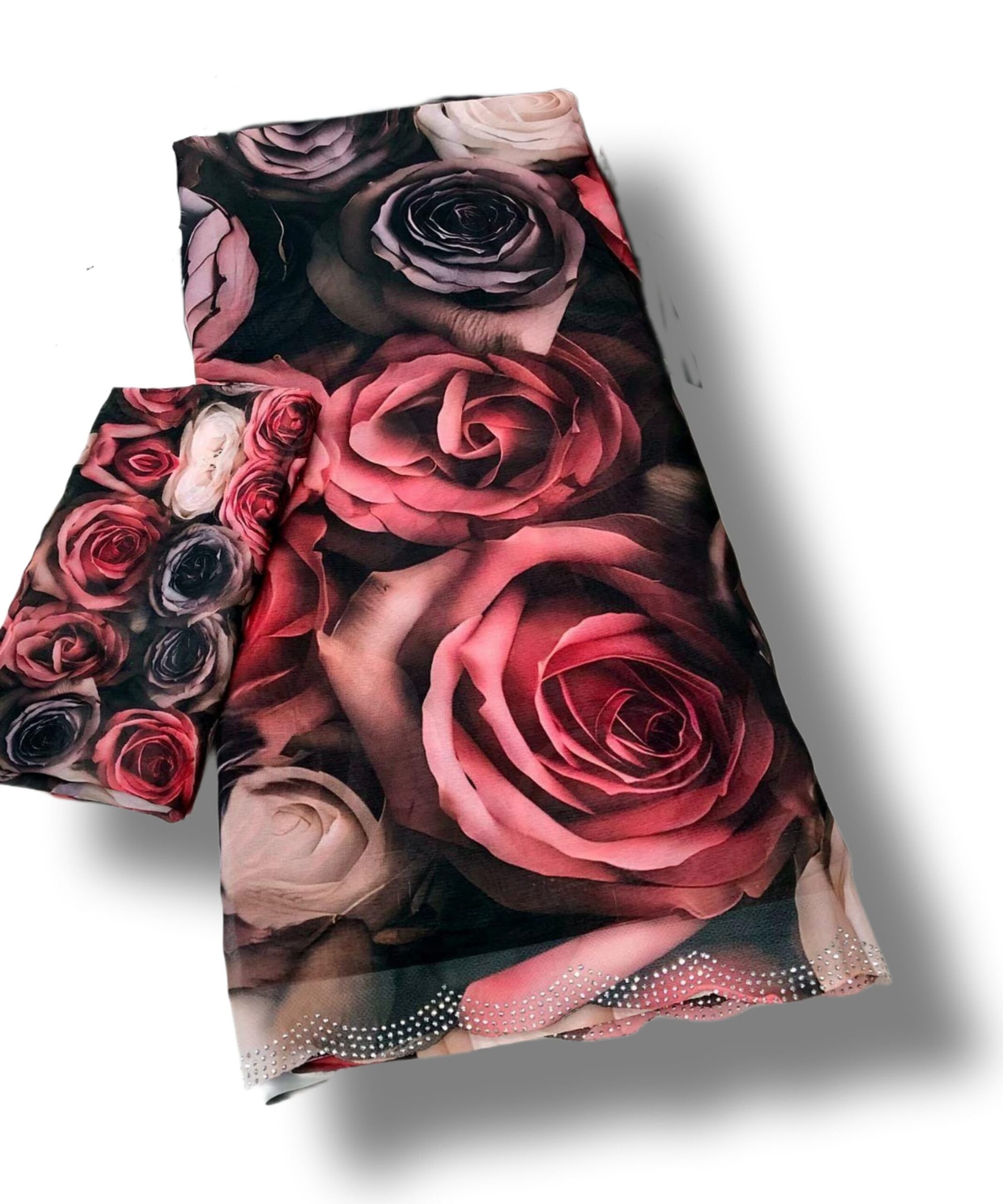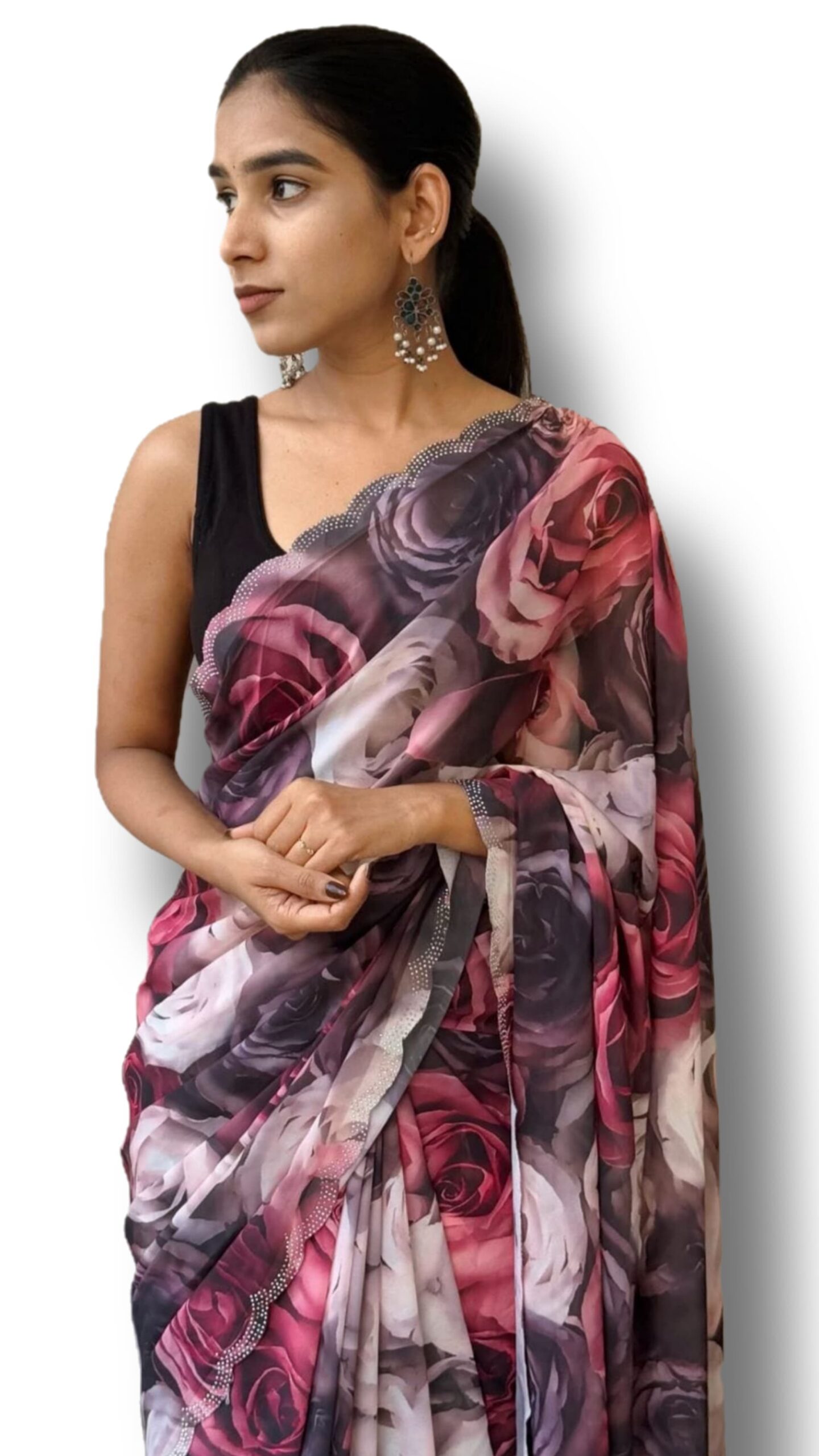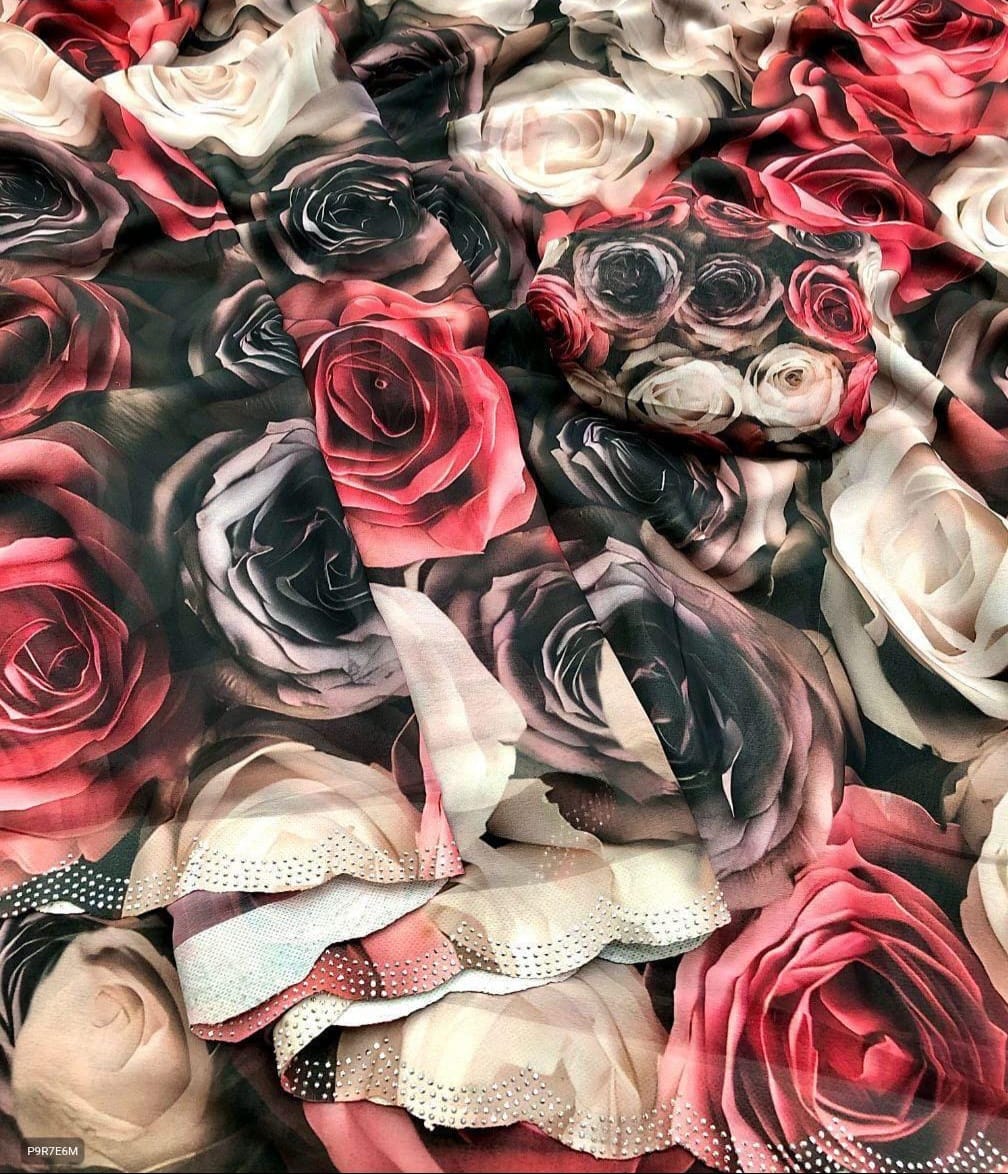 Mesmerizing Marshmellow Georgette Saree Bold floral print with soft flowy drape – paired with sparkling siroski scalloped border for that extra glam!