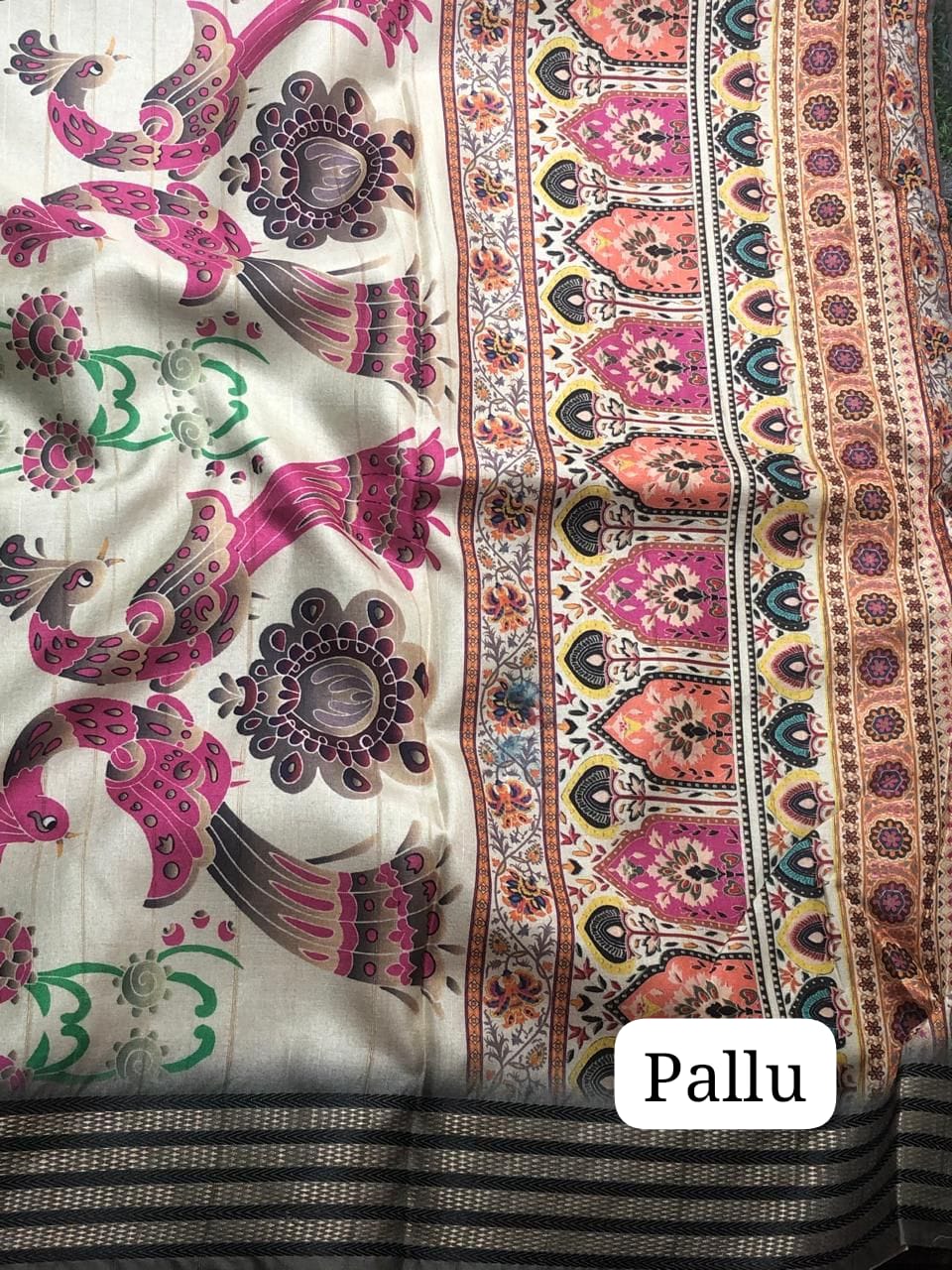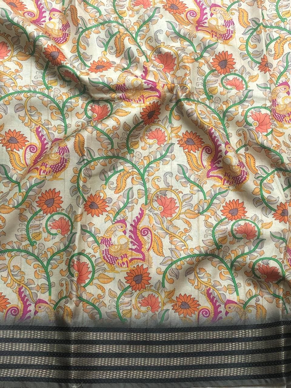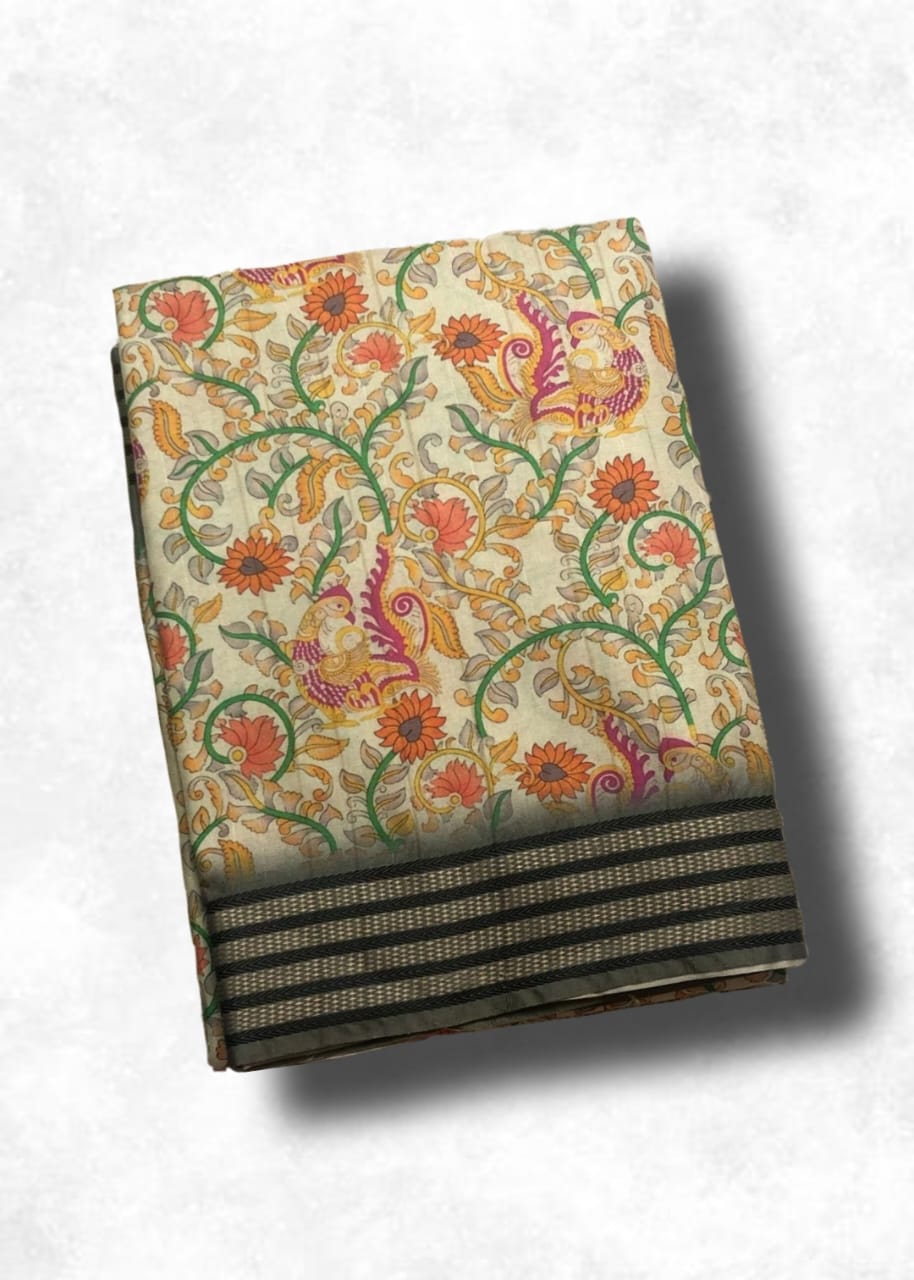 Beautiful soft silk saree with vibrant floral print, paired with a subtle yet classy blouse and a stunning peacock-designed pallu for a graceful look.