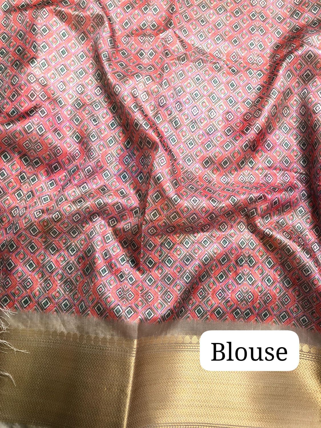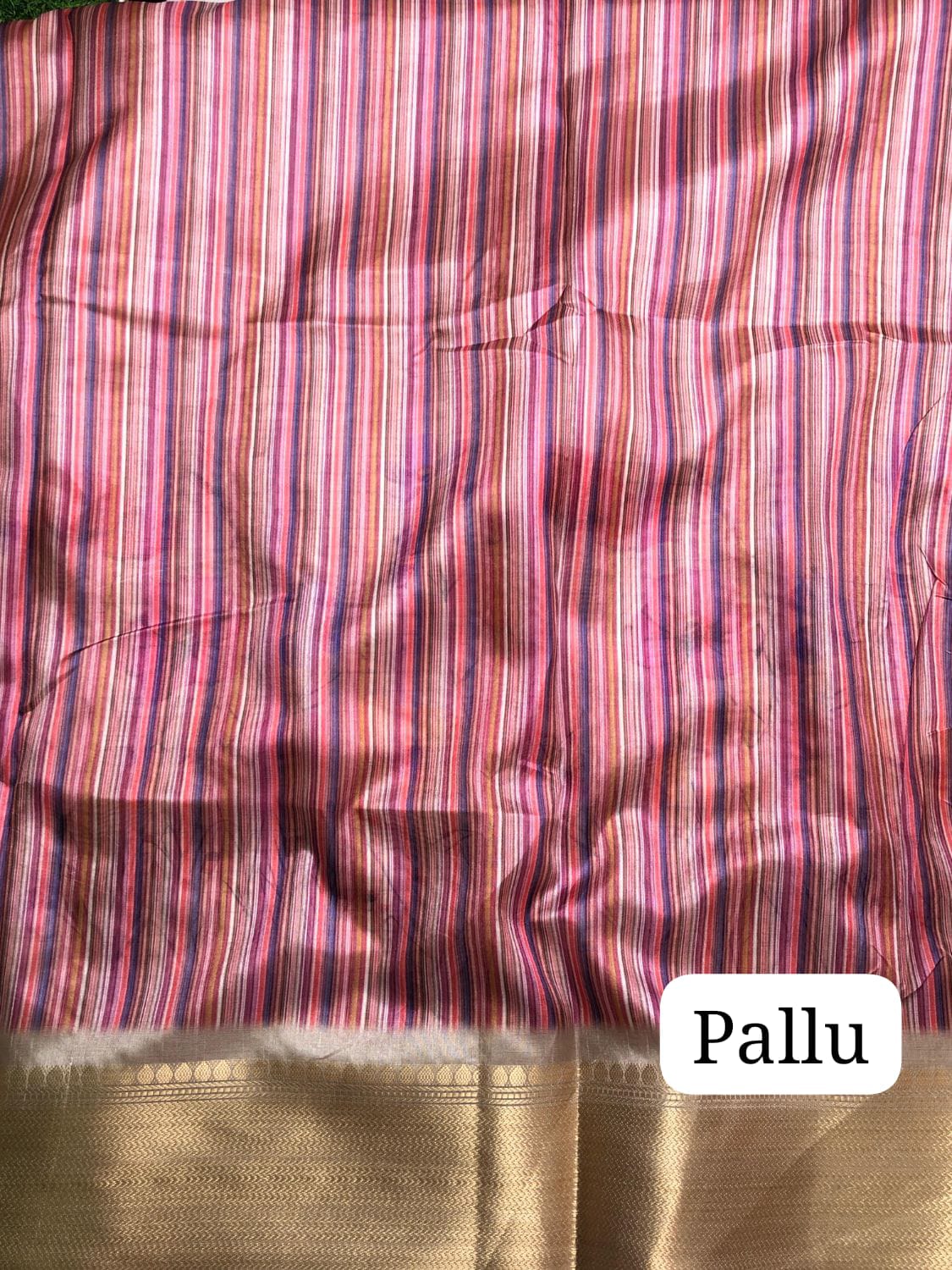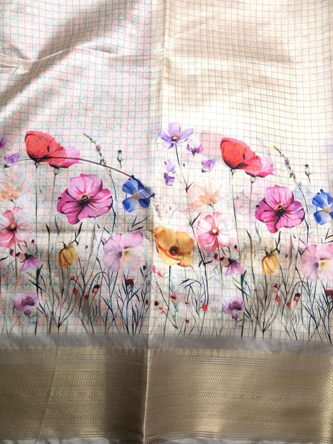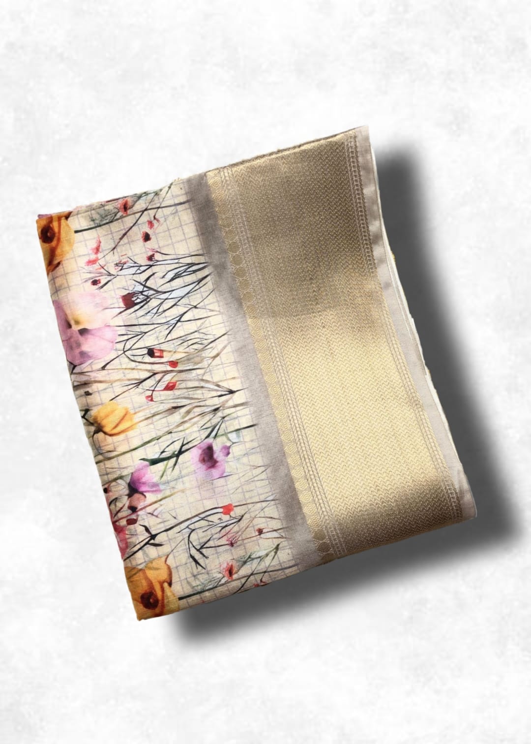 Charming beige dola silk saree with delicate floral digital print, paired with a vibrant multicolour striped pallu and golden woven border