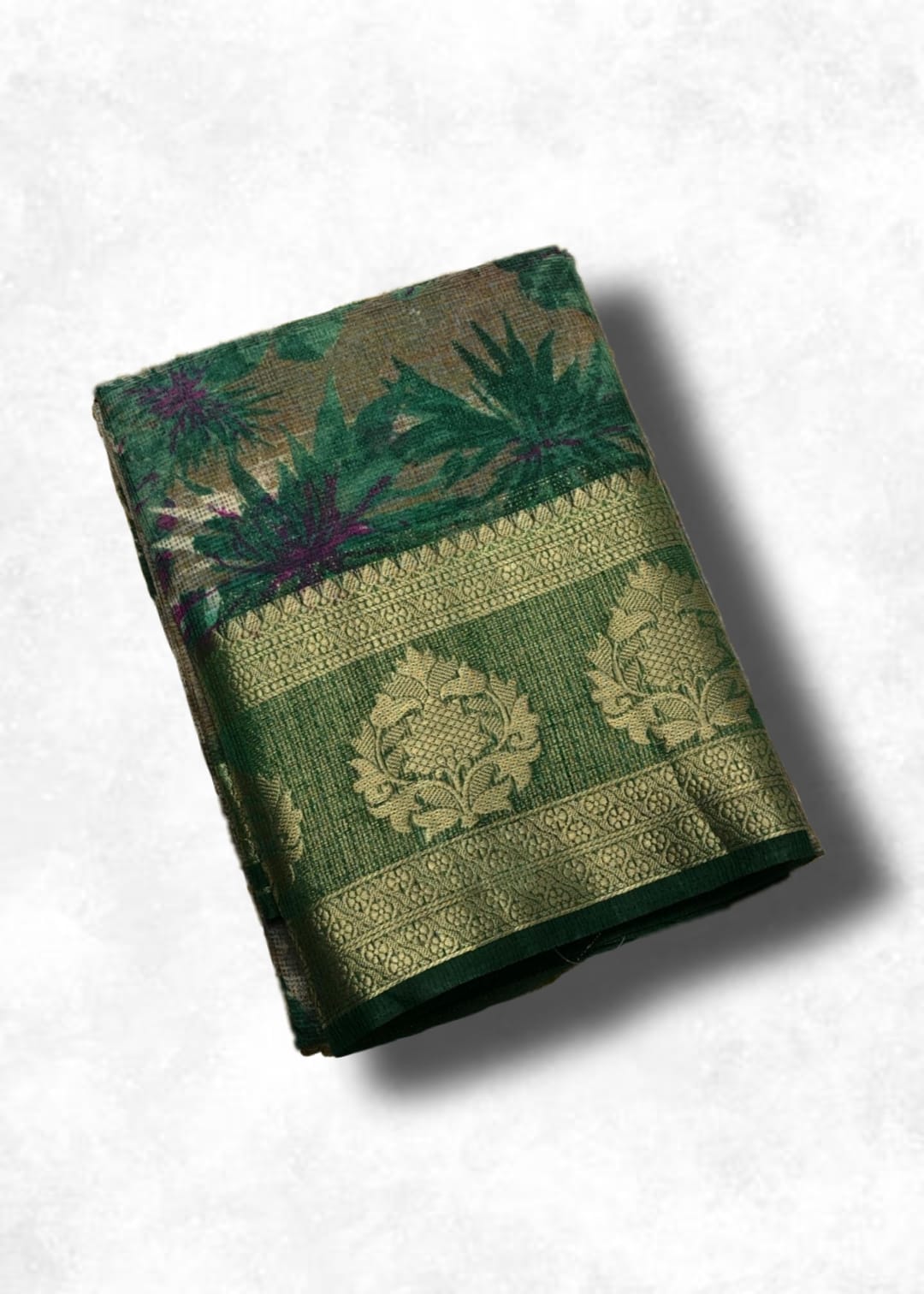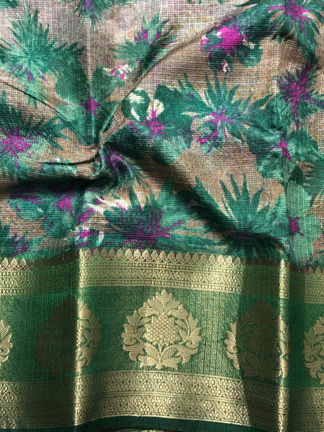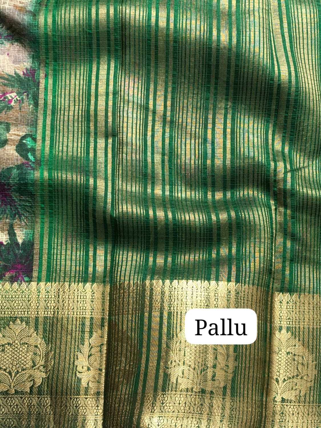 A rich green drape with shimmering zari stripes and elegant floral motifs – traditional charm in every fold!