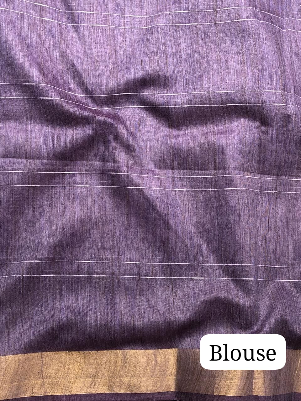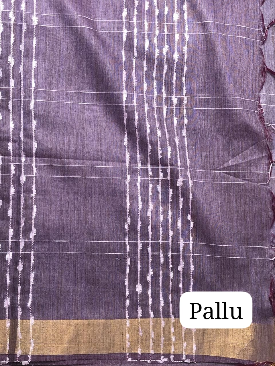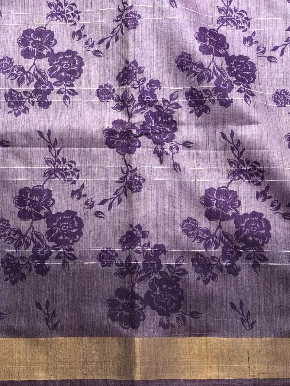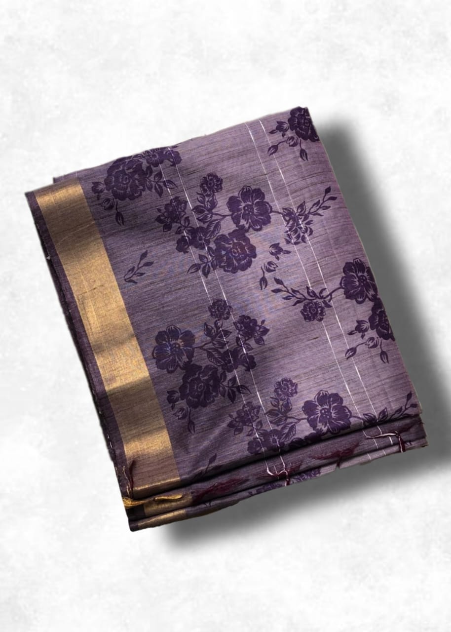Beautiful purple linen silk saree with delicate floral print, finished with a subtle zari border and a graceful striped pallu. Comes with a matching blouse piece for a complete classy look