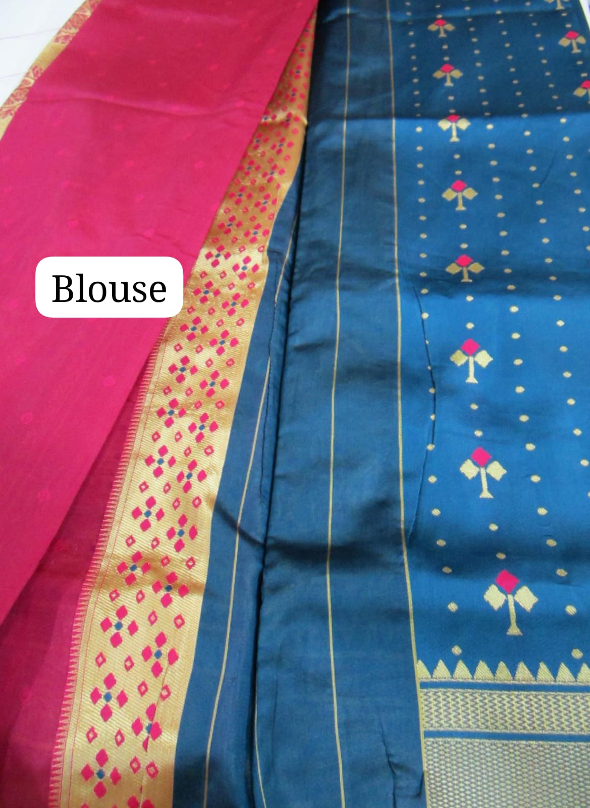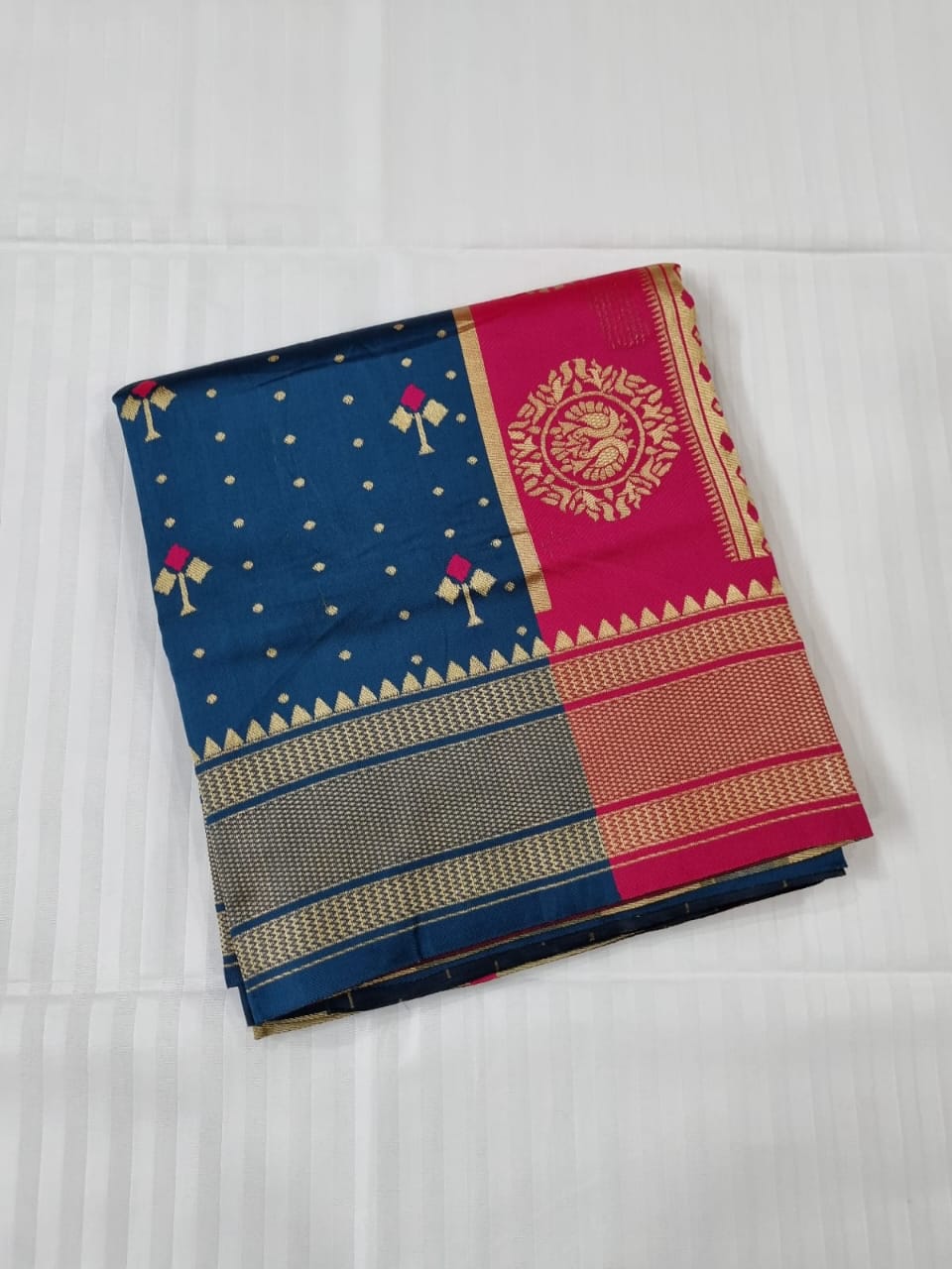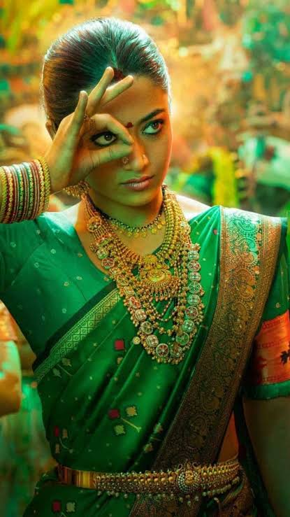 Channel the glamorous vibe of Rashmika Mandanna in Pushpa 2 with this stunning silk saree! Featuring striking contrast colors, vibrant zari work, and a rich, eye-catching pallu, it’s perfect for making a bold yet traditional statement at any festive occasion or celebration.