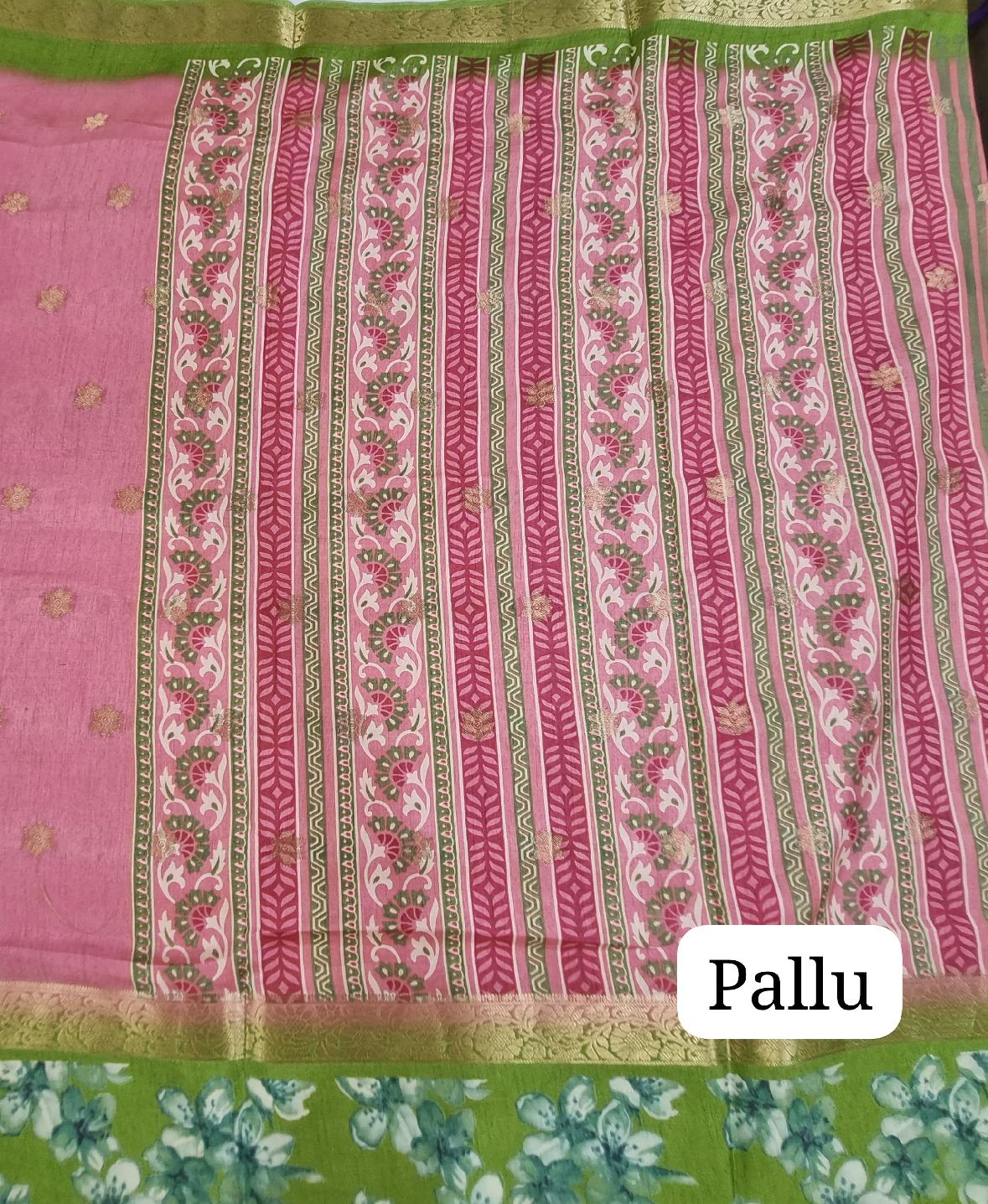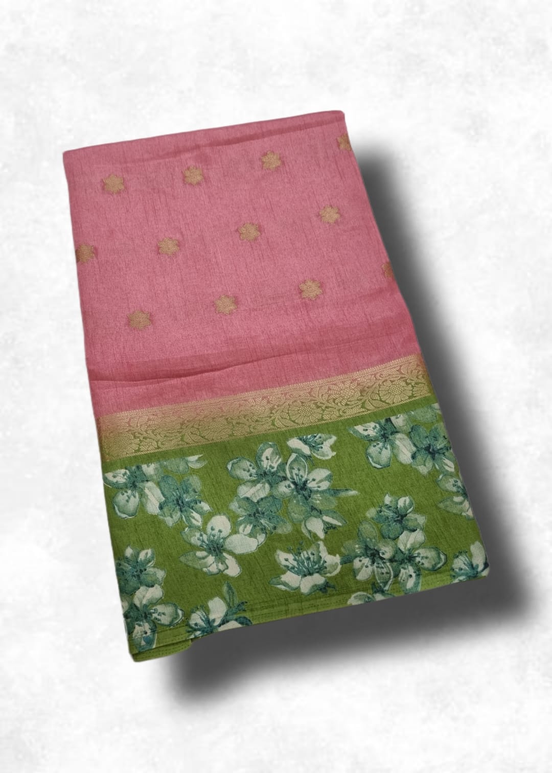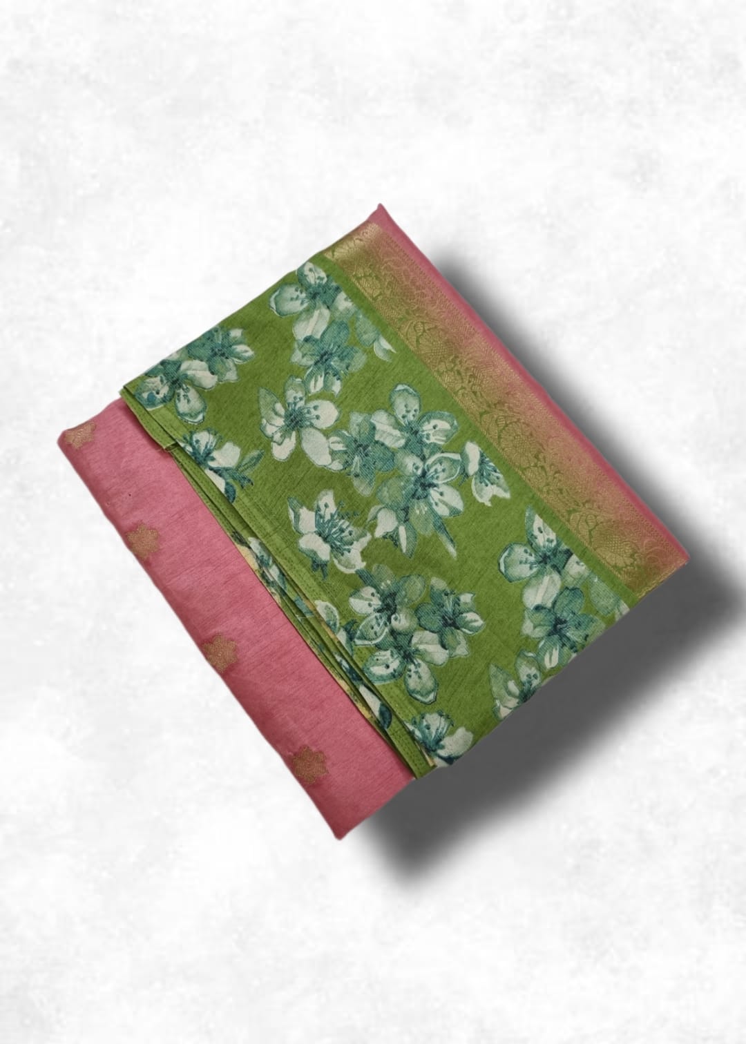 A delightful soft silk saree featuring a beautiful blend of floral designs and traditional golden zari work. The elegant pink & green combination with richly patterned pallu. Paired with a stylish woven blouse to complete the look